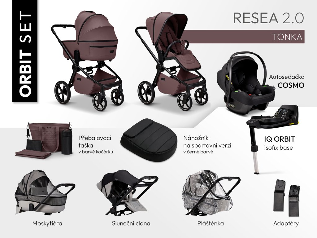 RESEA 2.0 ORBIT SETPro rodiče, kteří chtějí mít vše potřebné pohromadě, je k dispozici ORBIT SET, který kromě samotného kočárku obsahuje také:Bohaté příslušenství v ceně: