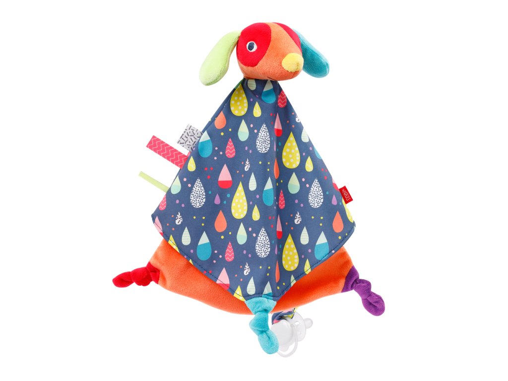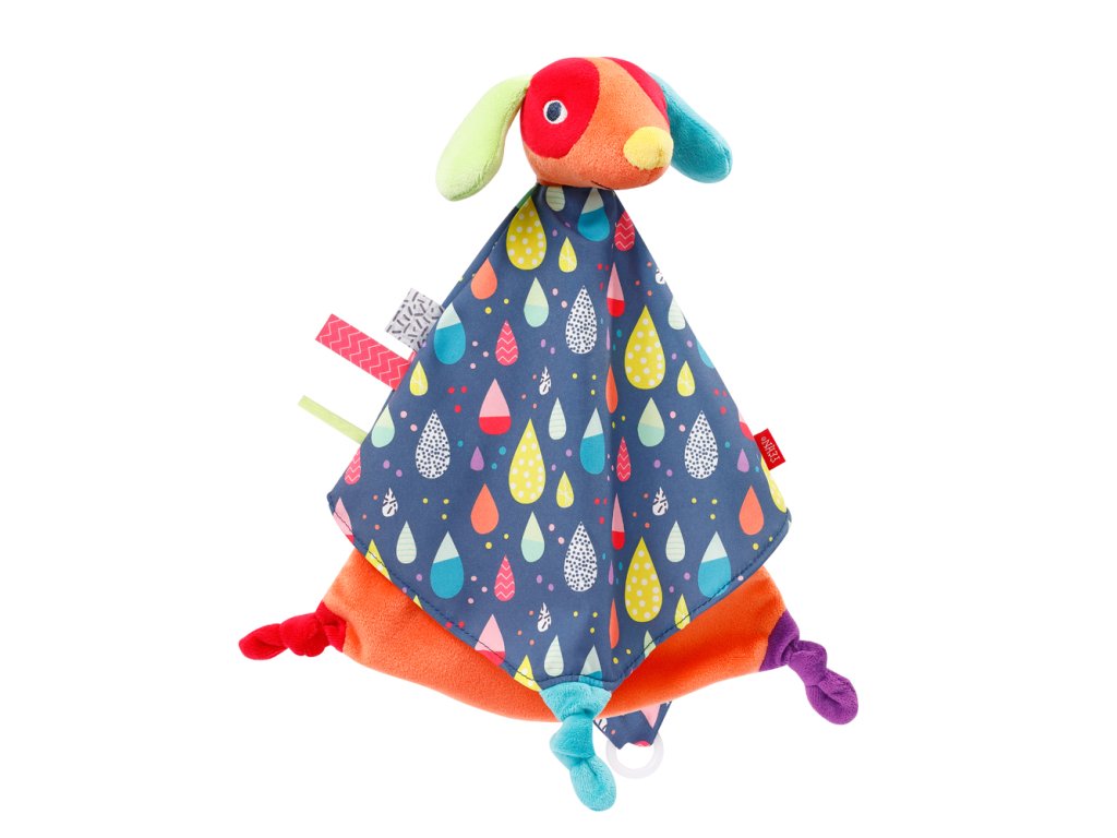 Pri zaspaní poskytuje roztomilý plyšový psík pohodlie – hlavička a zauzlené konce vyzývajú dieťa na uchopenie, cítenie a objatie.