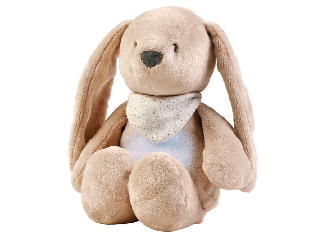 Zajačik na spanie Nattou je krásnej mäkkej kvality s príjemnou výplňou. Spiaci zajačik má v brušku svetielko, ktoré sa môže meniť medzi siedmimi farbami a zvukom, s bielym šumom, morom, tlkotom srdca a dvoma upokojujúcimi uspávankami, ktoré pomáhajú zabezpečiť pokojný spánok. Zvuky spiaceho zajačika sa aktivujú automaticky, keď započuje plač dieťaťa a zvuky automaticky prestanú po 15 minútach. Svetlo spiaceho zajačika vychádza z LED diódy v brušku, takže svetlo je tlmené textíliou zajačika a neprehrieva sa, teda svetlo môže bez problémov svietiť celú noc.
