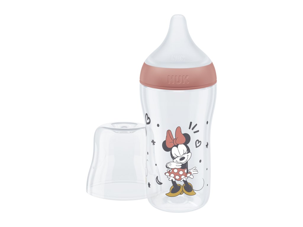 Dojčenská fľaša NUK Perfect Match Disney Mickey Mouse, s mäkkým silikónovým cumlíkom, 260 ml, od 3 mesiacov, neobsahuje BPA, antikolikový systém, s kontrolou teploty.