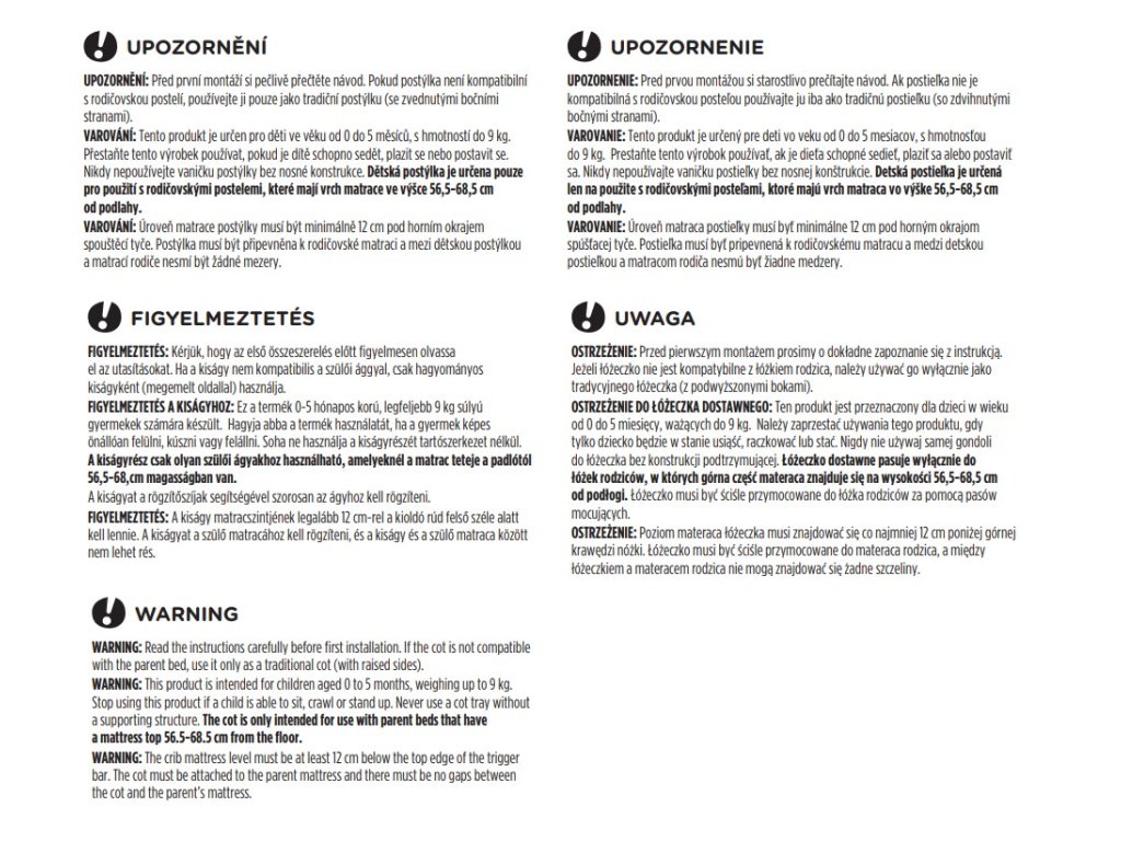 UPOZORNENIE! Tento produkt je určený pre deti vo veku od 0 do 5 mesiacov, s hmotnosťou do 9 kg. Prestaňte tento výrobok používať, ak je dieťa schopné sedieť, plaziť sa alebo postaviť sa. Nikdy nepoužívajte vaničku postieľky bez nosnej konštrukcie. Detská postieľka je určená len na použitie s rodičovskými posteľami, ktoré majú vrch matraca vo výške 56,5-68,5 cm od podlahy.