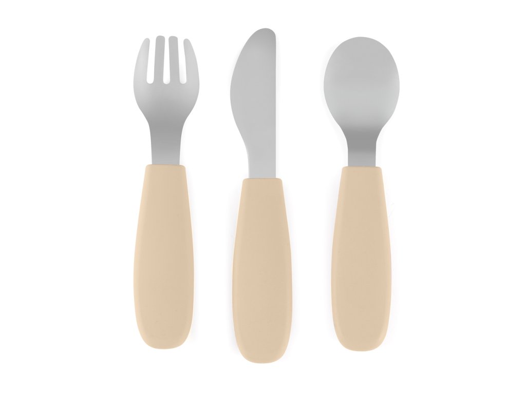 Funkčné časti sú vyrobené z kvalitnej nehrdzavejúcej ocele, rukoväte sú ergonomické a potiahnuté mäkkým silikónom vhodným na kontakt s potravinami – ideálne prispôsobené detským rúčkam. To zaručuje pohodlný a istý úchop a podporuje správne stravovacie návyky.