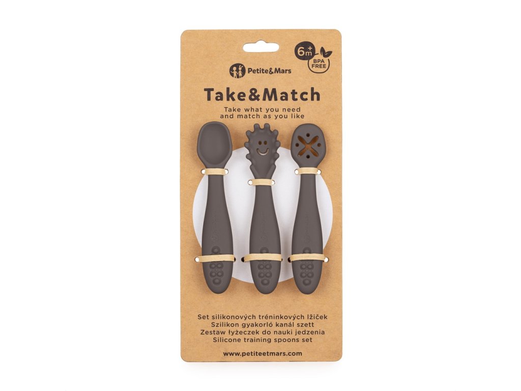 PETITE&MARS Set 3 ks silikónových tréningových lyžičiek Take&Match Bitter Cocoa 6m+
