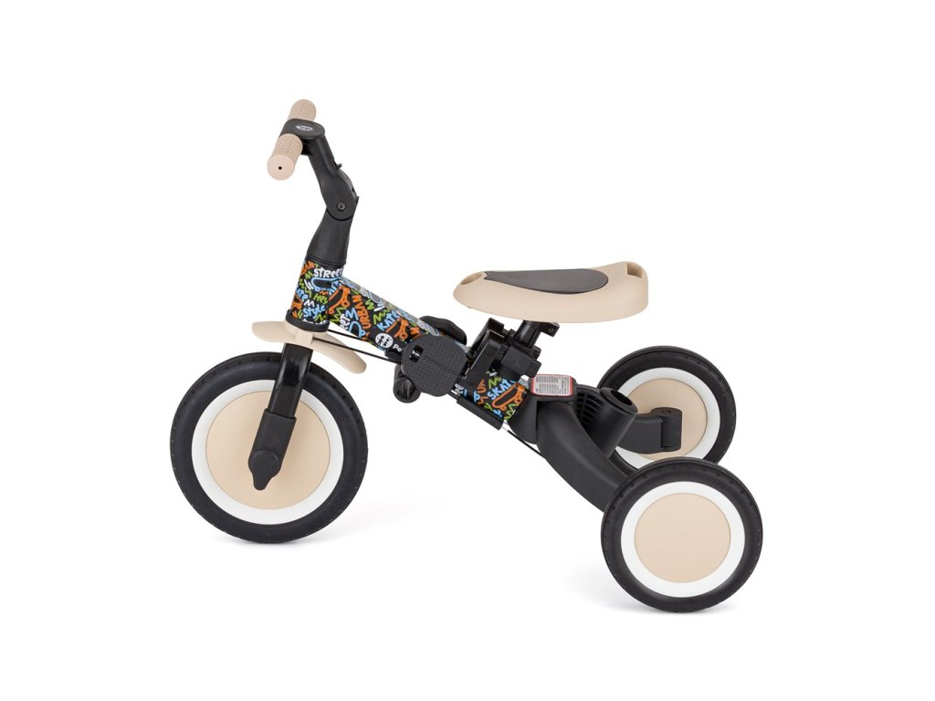 Multifunkčná trojkolka určená pre deti od 1,5 do 5 rokov alebo do 25 kilogramov je nielen dopravný prostriedok na presun a učenie sa rovnováhy, ale aj spoločník pre rastúce dieťa počas mnohých vývojových fáz. Vďaka premyslenej transformácii sa prispôsobí aktuálnym motorickým schopnostiam dieťatka – od trojkolky s asistenciou rodiča až po plnohodnotný bicykel s pedálmi.