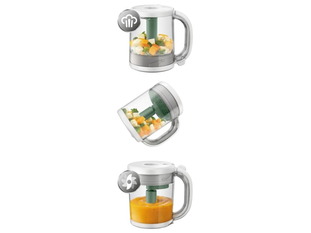 Jednoduché výživné jedlá pre deti - stačí otočiť nádobu - varte v pare, mixujte, rozmrazujte a ohrievajte - jedinečné prevedenie 4 v 1.