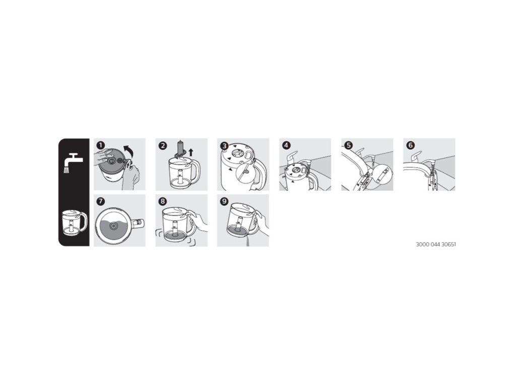 - Nádobu ani inú časť zariadenia (okrem odkladacej nádoby) nikdy nesterilizujte v sterilizátore ani v mikrovlnnej rúre, pretože kovové časti rukoväti nádoby a nadstavec s čepeľami nie sú na takéto použitie vhodné.
