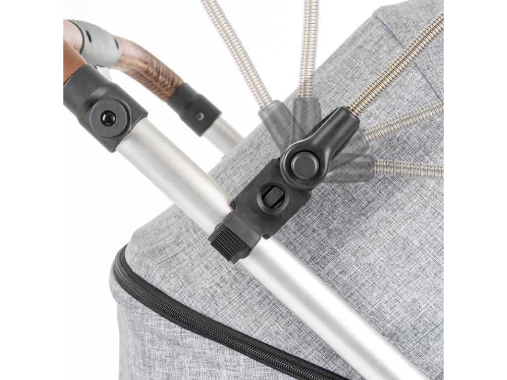 Univerzálny držiak sa prispôsobí šírke rámu akéhokoľvek kočíka. Slnečník možno bezpečne pripevniť na konštrukcie s guľatým aj oválnym profilom a to ako na rukoväť, tak aj na prednej madlo alebo napríklad priamo na rám kočíka.