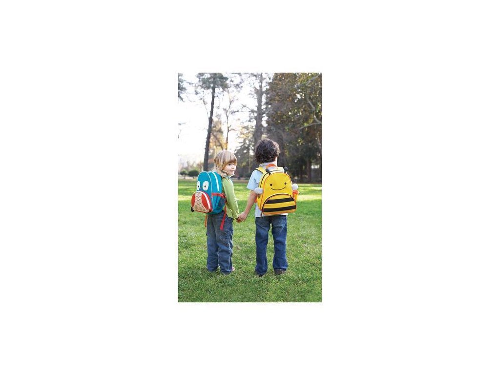 Krásny batôžtek v štýle SKIP HOP. Prepracované detaily batôžku ladia s veselými motívmi na zipse. Predné oddelená vrecko ideálne na desiatu s extra vreckom na pastelky a pre ďalšie nevyhnutnosti na cesty. Priestranná postranné sieťované vrecko na pitie. Pohodlné nastaviteľné polstrované ramenné popruhy. Ucho pre prenášanie. Jednoduchá údržba.