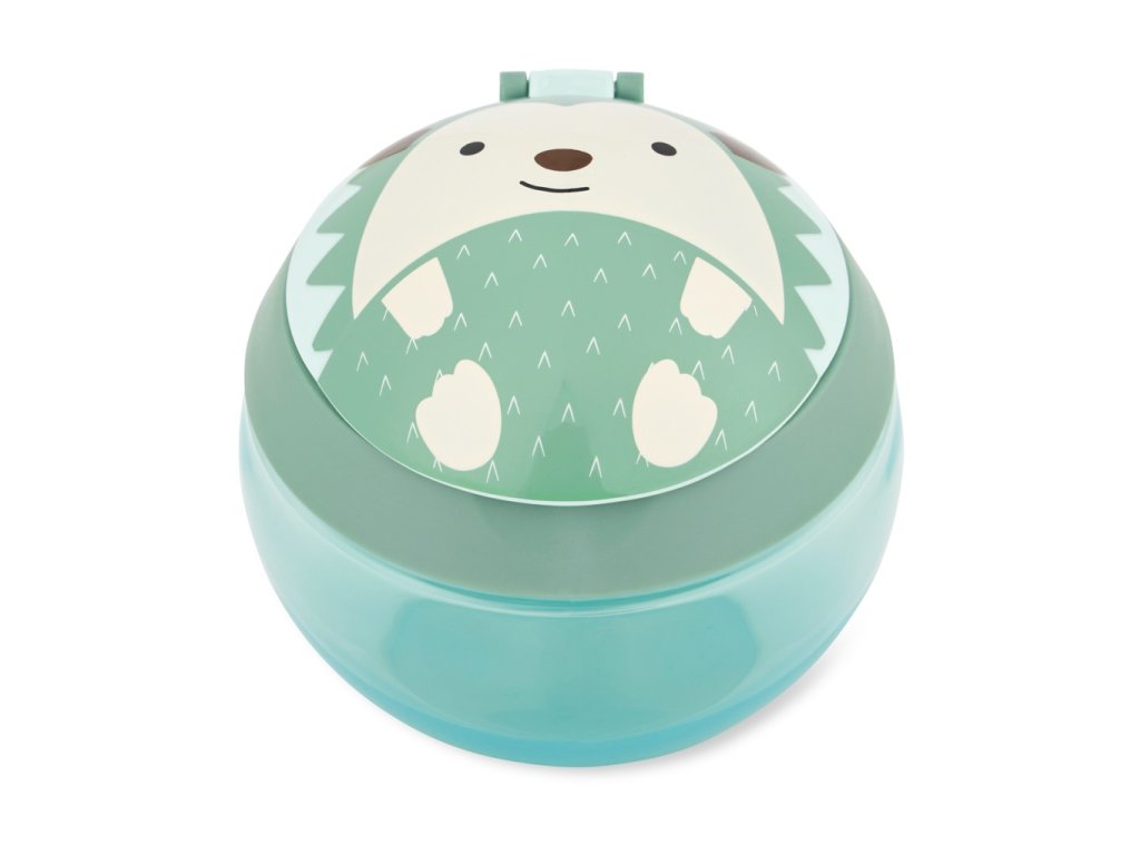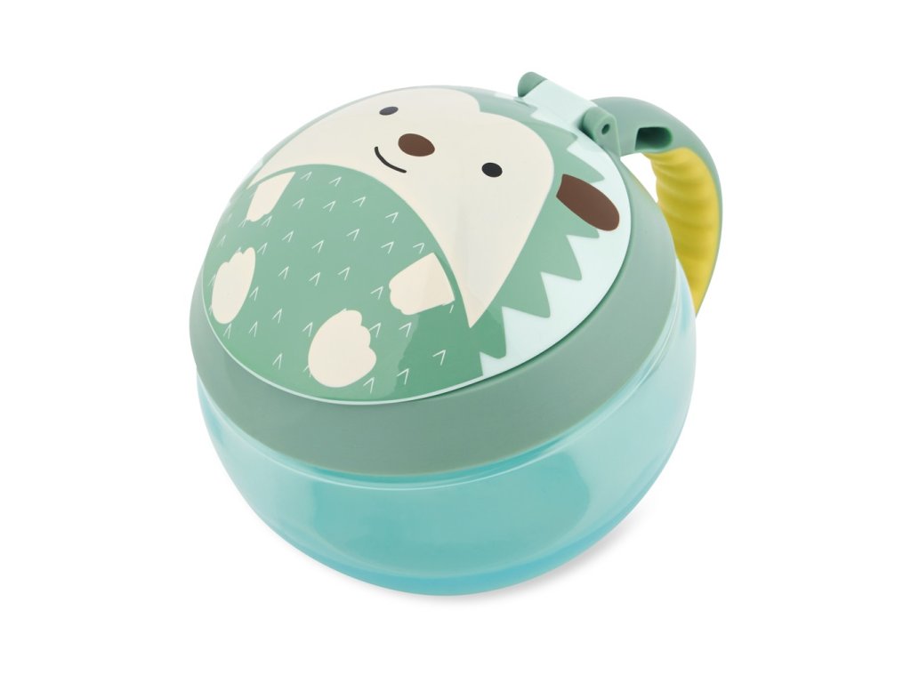 Šikovný nápad na cesty. Nádoba má viečko, ktoré po otvorení drží, pred vysypaním obsahu ho chránia pružné lamely, ktoré pustia detskú ručičku dovnútra, ale nepustia desiatu von. Nádoba je priehľadná, aby sa mohla zavčasu doplniť. Na boku je praktické uško v detskom rozmere, pomocou ktorého možno nádobu pripevniť aj na kočík či tašku. 0% BPA, 0% PVC, bez ftalátov. Obsah: 222 ml. Priemer: 10 cm