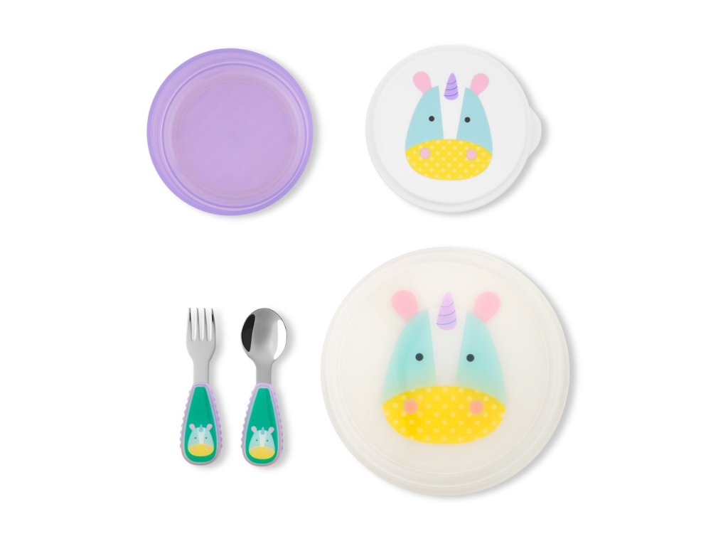 - 5-dielny set zahŕňa: protišmykový tanier, misku s vrchnákom, vidličku a lyžičku.