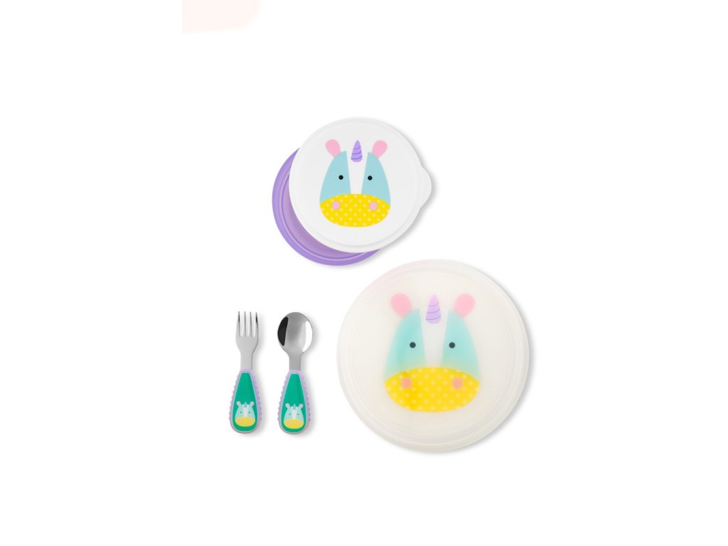 Živé farby a veselé motívy zvieratiek z obľúbenej ZOO kolekcie urobia z každého jedenia sviatok. Táto roztomilá jedálenská štartovacia súprava podporí nezávislosť Vášho batoľaťa pri jedení. Každá ZOO® súprava s jedinečnými veselými zvieratkami obsahuje protišmykový tanierik a misku s vekom a tiež vidličku a lyžičku v rovnakom dizajne. Praktické veko na misu pomáha udržiavať obľúbené potraviny čerstvé, zatiaľ čo nerezový príbor má strany prispôsobené na jednoduché uchopenie, takže malé ručičky ho môžu pevne držať.