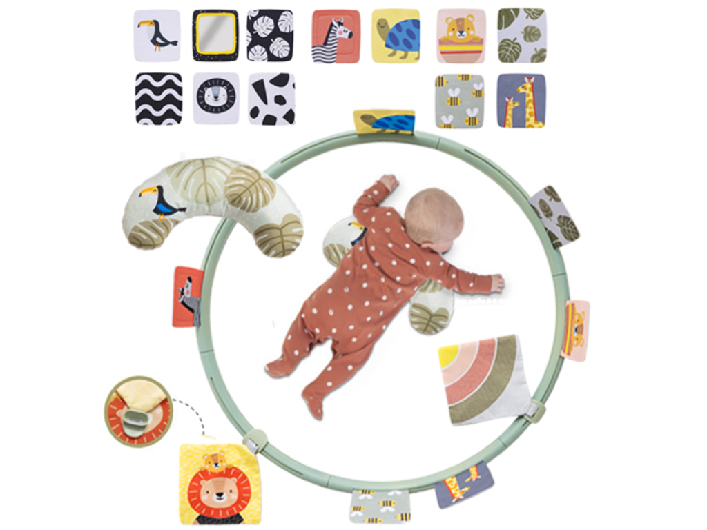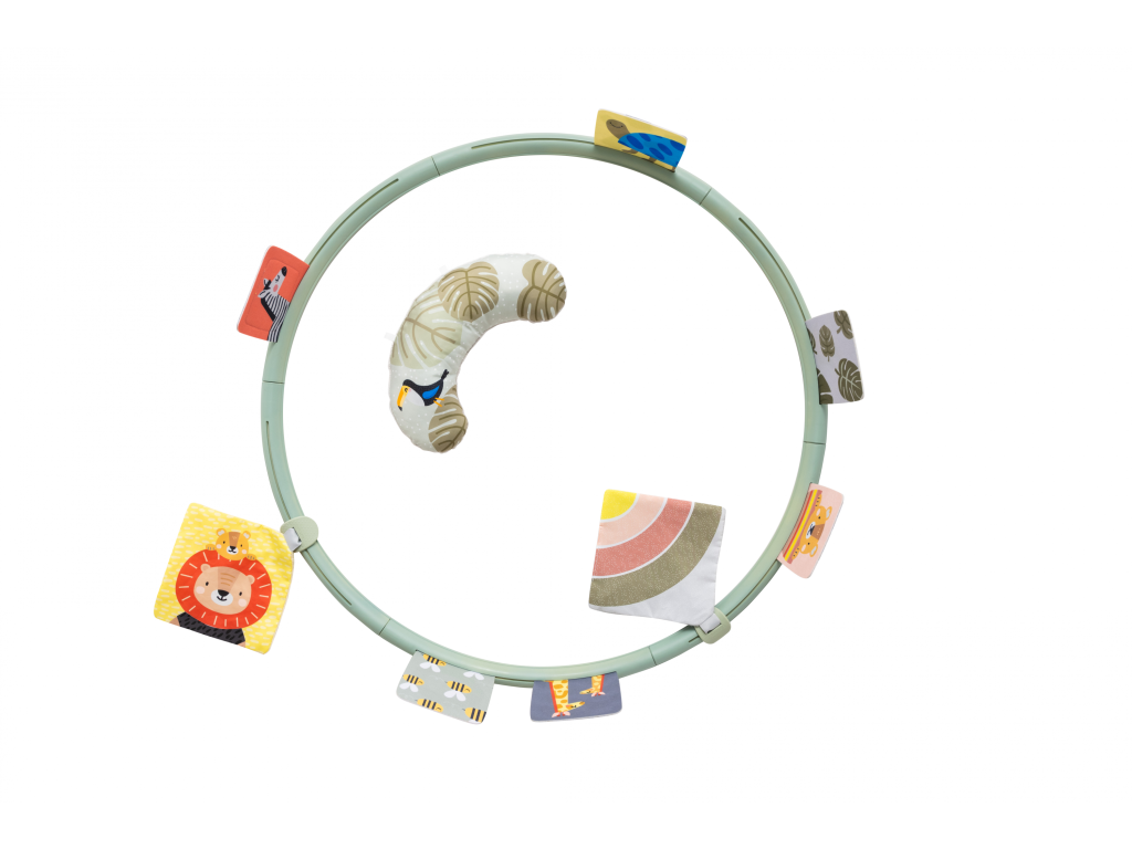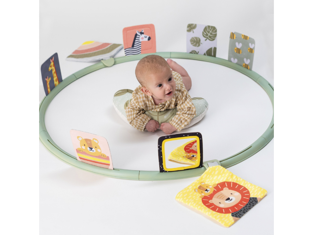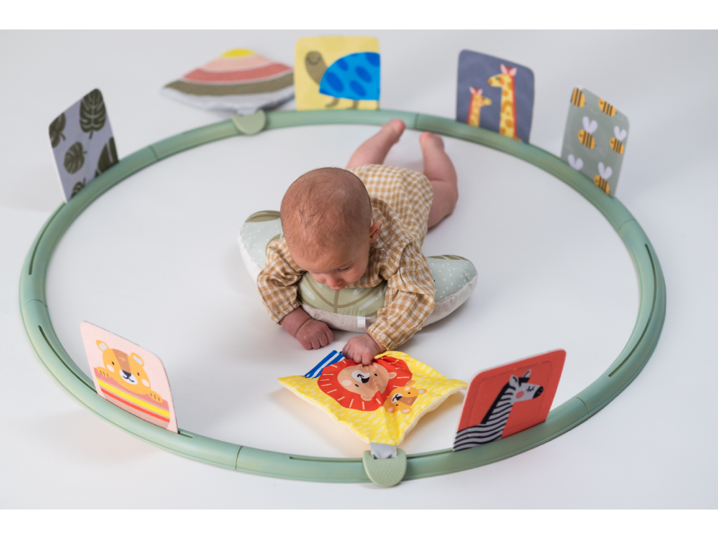 Unikátny hrací kruh ponúka 16 rôznych aktivít podporujúcich hranie dieťaťa na brušku. Kruh sa skladá z niekoľkých dielov, ktoré rýchlo a jednoducho spojíte dohromady. Do otvorov v kruhu môžete pripevniť ľubovoľné kombinácie aktivít a pripraviť tak dieťaťu vždy nové prostredie na skúmanie a hranie. Vankúšik z mäkkého, príjemného materiálu je špeciálne navrhnutý, aby podporoval hranie dieťaťa na brušku. Poloha na brušku je dôležitá pre posilňovanie krčných a chrbtových svalov, ktoré neskôr umožňujú dieťaťu začať sa pretáčať, liezť a sedieť bez opory.
