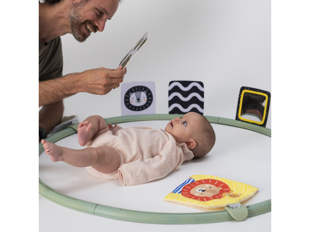 Súprava obsahuje špeciálne navrhnuté aktivity pre dve vývojové štádiá dieťaťa. Pre bábätko od narodenia sú určené vysoko kontrastné obrázky v čierno-bielom prevedení aj bezpečné zrkadlo. Pre deti od 3 mesiacov sú určené obrázky vo výrazných farbách a dva textilné šustiace štvorce s rôznymi obrázkami a textúrami na skúmanie.