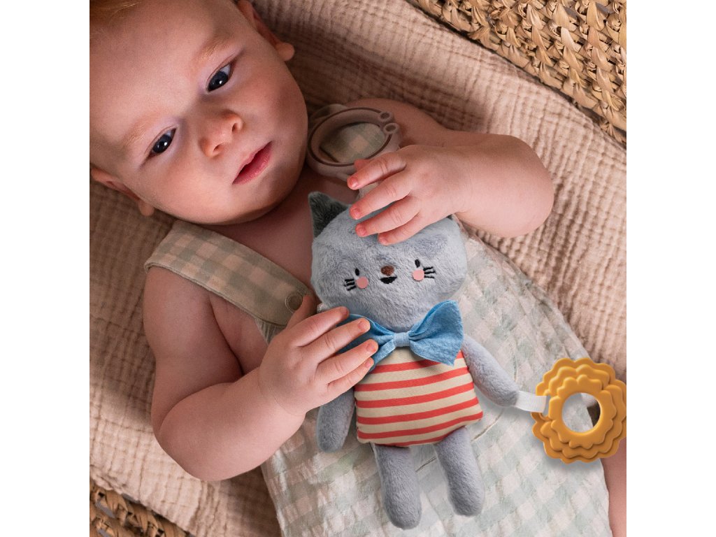 Závesná plyšová hračka v podobe rozkošnej mačičky Clary pri pohybe hrkajú a pri stlačení šuštia. Súčasťou hračky je aj pružné hryzátko v tvare kvietku. Vďaka závesnému krúžku hračku ľahko pripevníte napr. na autosedačku či kočík.