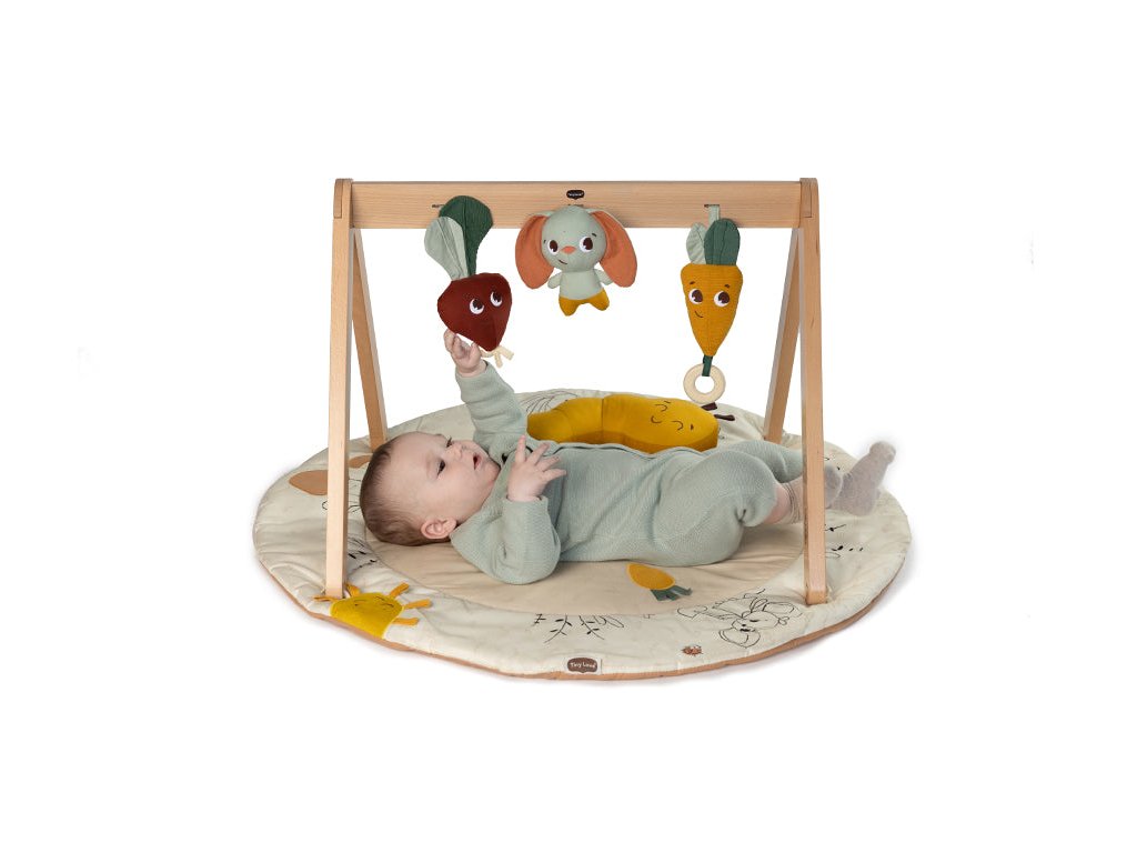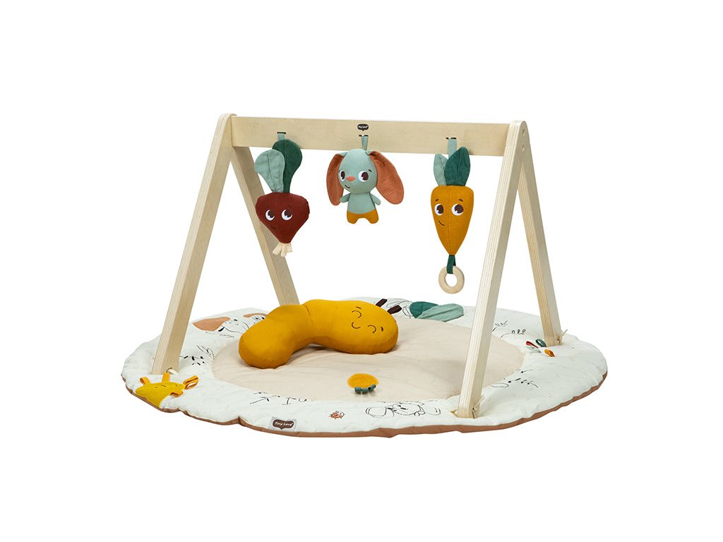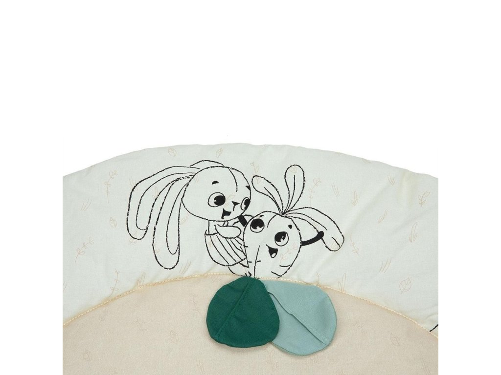 Odnímateľná drevená hrazda umožňuje zavesenie hračiek v podobe chrastiacej repy, rozkošného zajačika a mrkvičky s krúžkom na uchopenie. Priamo na deke nájdete textilné aplikácie s rôznymi textúrami na skúmanie.