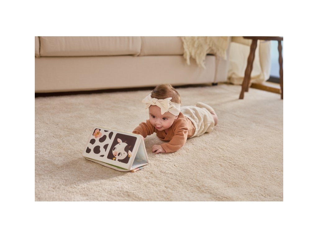 Detská knižka pre hru na brušku Tiny Love je mäkká, skladacia hračka, ktorá ponúka 4 varianty použitia pri hraní bábätka na brušku. Vysoko kontrastné obrázky, bezpečné zrkadlo, hryzátko a ďalšie aktivity lákajú bábätko na skúmanie a pomáhajú ho tak udržať dlhšie v polohe na brušku, ktorá je dôležitá pre posilňovanie jeho krčných a chrbtových svalov. Knižku môžete aj zložiť a pripevniť na kočík, takže zabaví vaše dieťa aj na cestách.