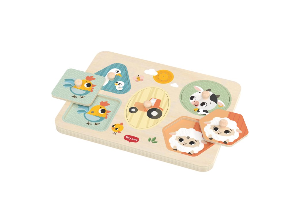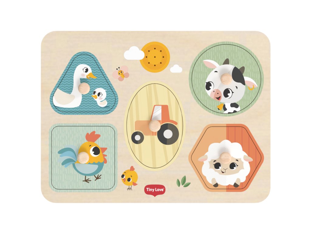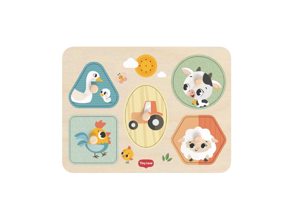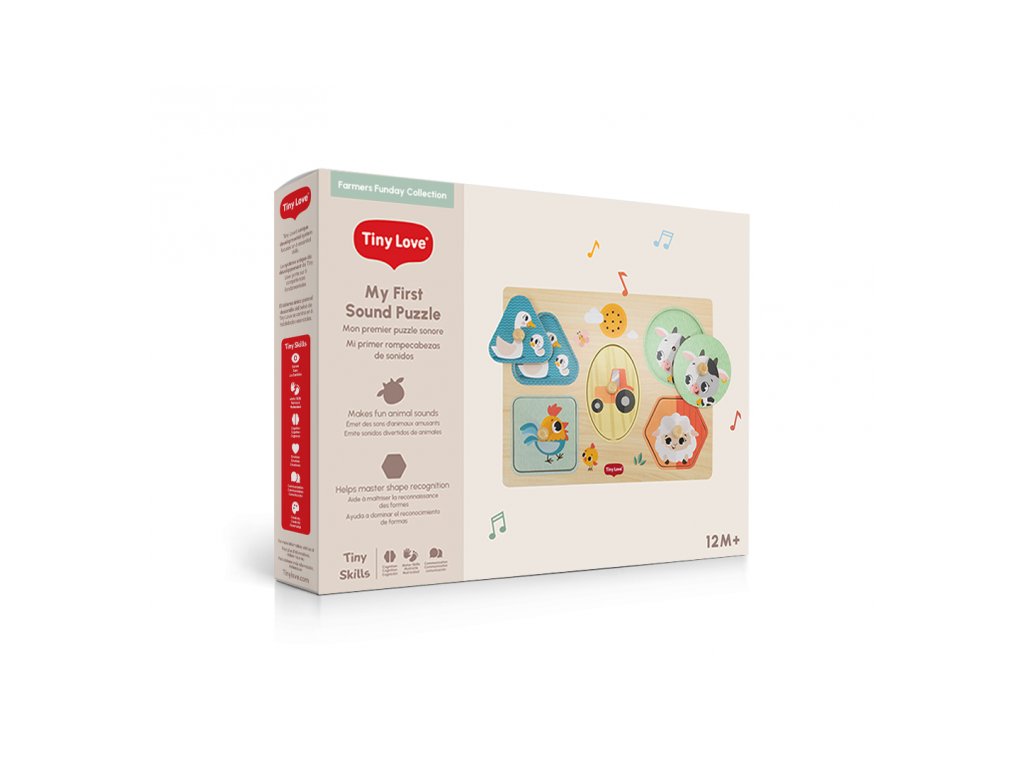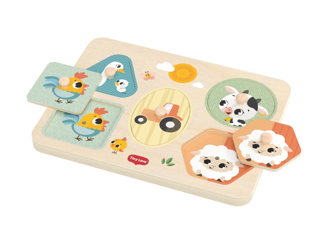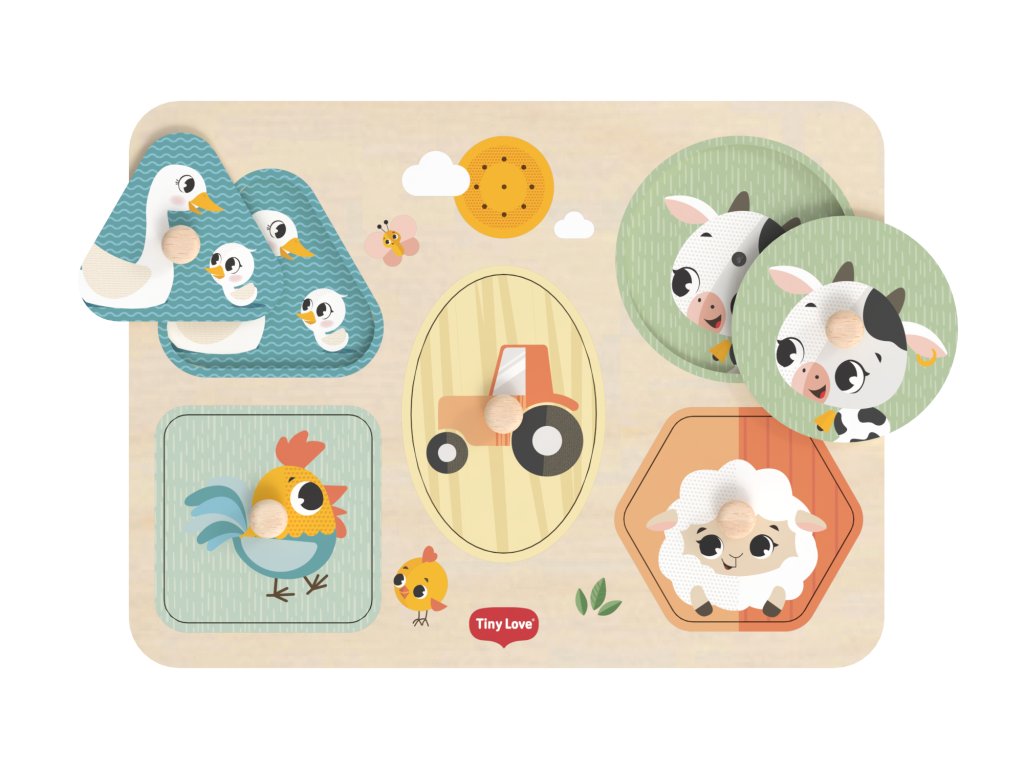 Drevené zvukové puzzle Tiny Love sú zábavná vkladačka pre najmenších, ktorá učí deti rozpoznávať tvary, farby a zvieratká. Päť veľkých dielikov rôznych tvarov s ilustráciami motívov zo života na farme sa vďaka úchytom ľahko drží. Pri vložení dielika na správne miesto je dieťa odmenené zvukom zvieratka, ktoré je na dieliku namaľované. Dieťa sa tak učí vzťahu "príčina - následok", uchopovaním a vkladaním dielikov sa rozvíja jeho jemná motorika a koordinácia "ruka - oko".