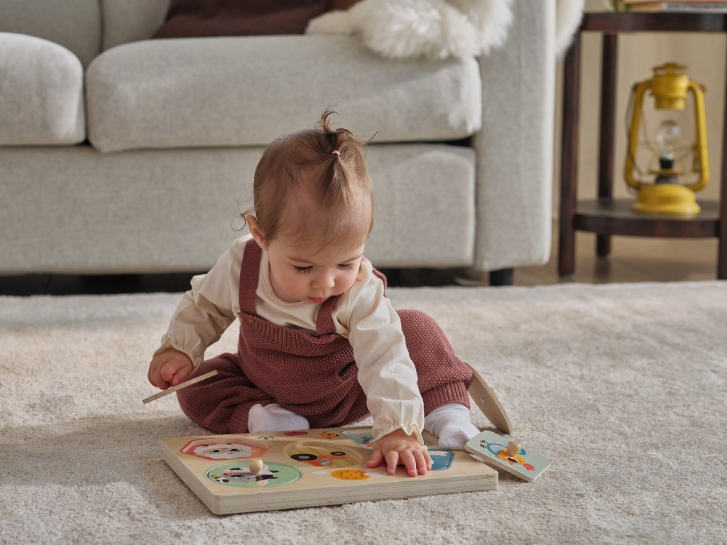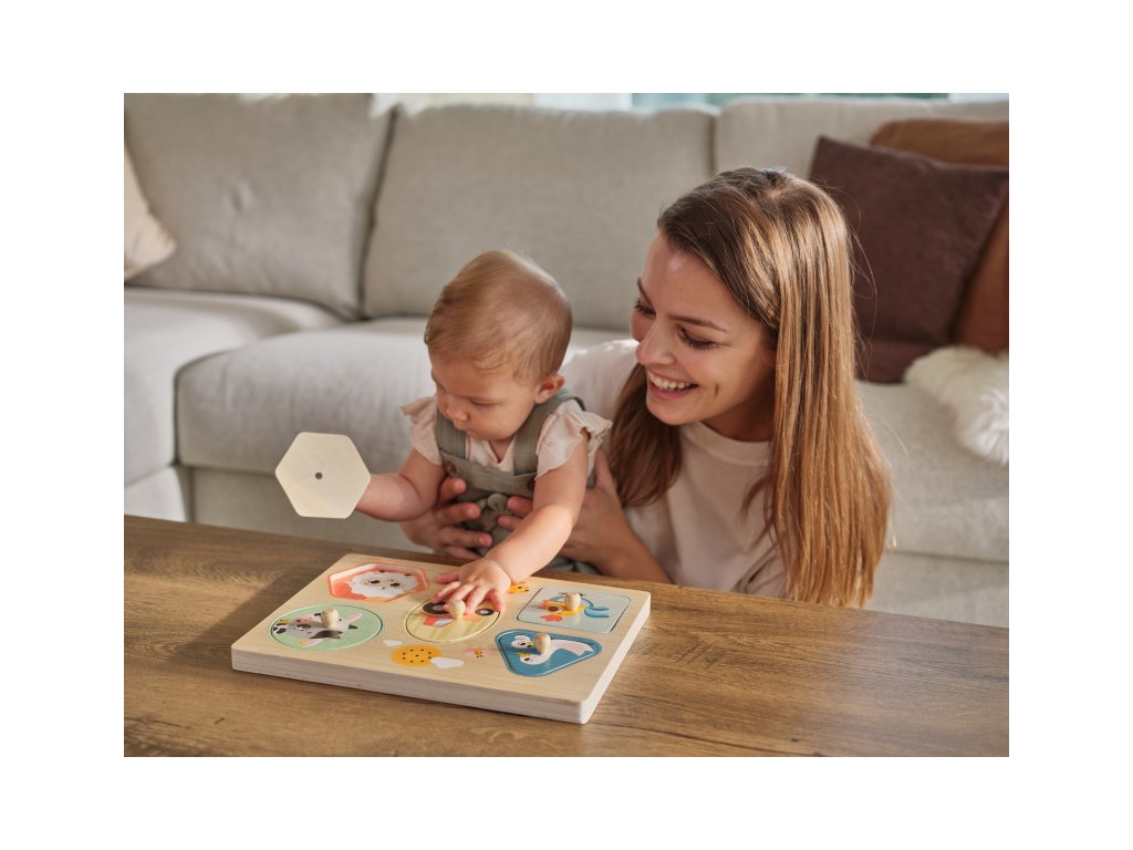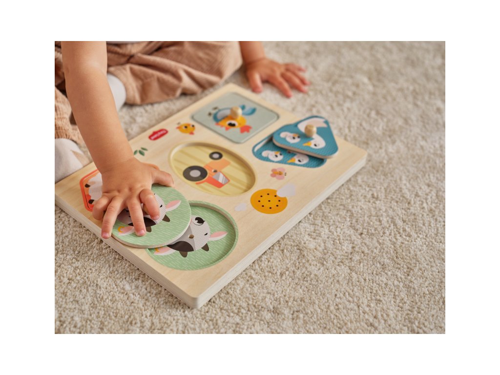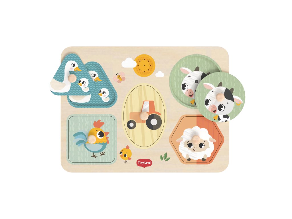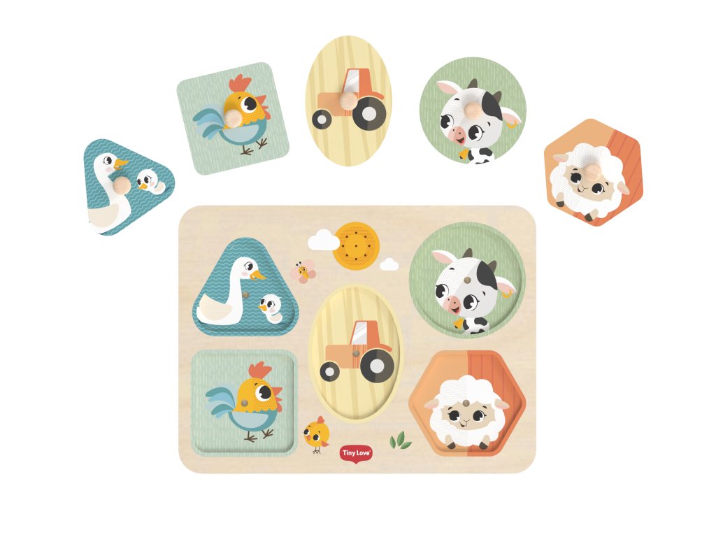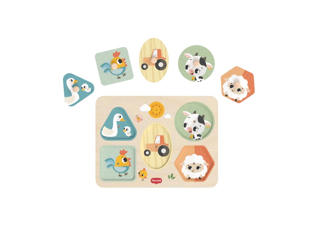 Drevené zvukové puzzle Tiny Love sú zábavná vkladačka pre najmenších, ktorá učí deti rozpoznávať tvary, farby a zvieratká. Päť veľkých dielikov rôznych tvarov s ilustráciami motívov zo života na farme sa vďaka úchytom ľahko drží. Pri vložení dielika na správne miesto je dieťa odmenené zvukom zvieratka, ktoré je na dieliku namaľované. Dieťa sa tak učí vzťahu "príčina - následok", uchopovaním a vkladaním dielikov sa rozvíja jeho jemná motorika a koordinácia "ruka - oko".