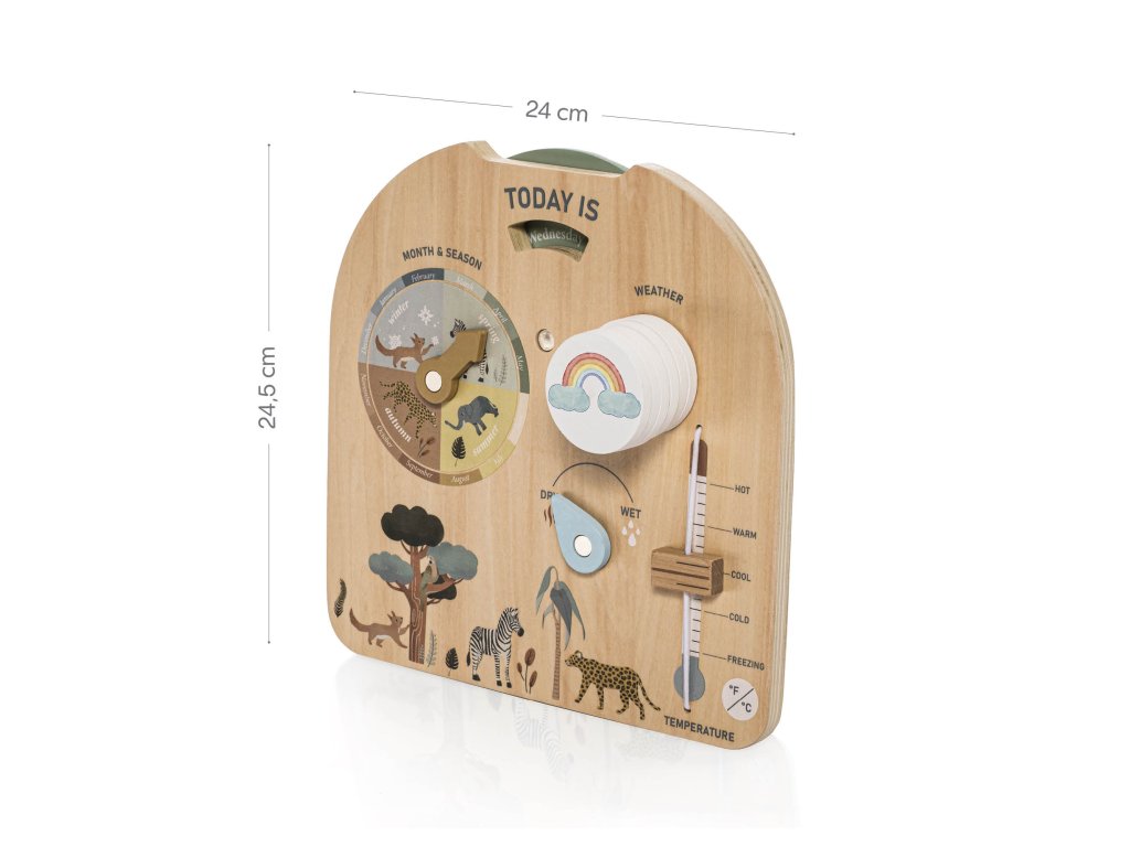 Táto doska je perfektná edukačná pomôcka do domácnosti aj materskej školy. Umožňuje deťom pochopiť denný rytmus, premenlivosť počasia aj základné prírodné javy zábavnou a názornou formou. Interaktívne prevedenie povzbudzuje deti k každodennému používaniu – vybrať deň, zhodnotiť počasie za oknom, nastaviť vlhkosť aj teplotu.Zároveň rozvíja logické myslenie, jemnú motoriku, predstavivosť a slovnú zásobu. Ideálny darček, ktorý má zmysel a dlho vydrží!